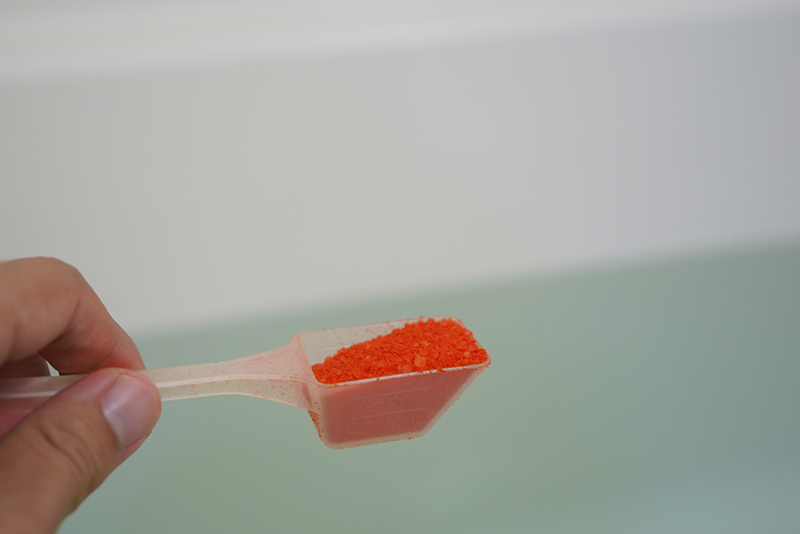 入浴剤自体の色は、人参のような色をしています。粉を入れるためのスプーンも付属しているので、直接入浴剤を袋から入れるタイプに比べて計量がとてもしやすいのも特徴です!